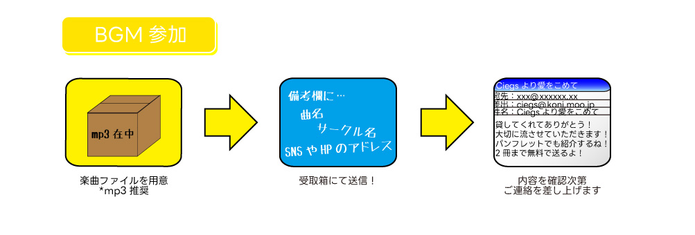 ご提供いただいた楽曲は「曲名、サークル名、SNSやHPのURL」を当日無料配布するイベントパンフレットにてご紹介させていただきます。